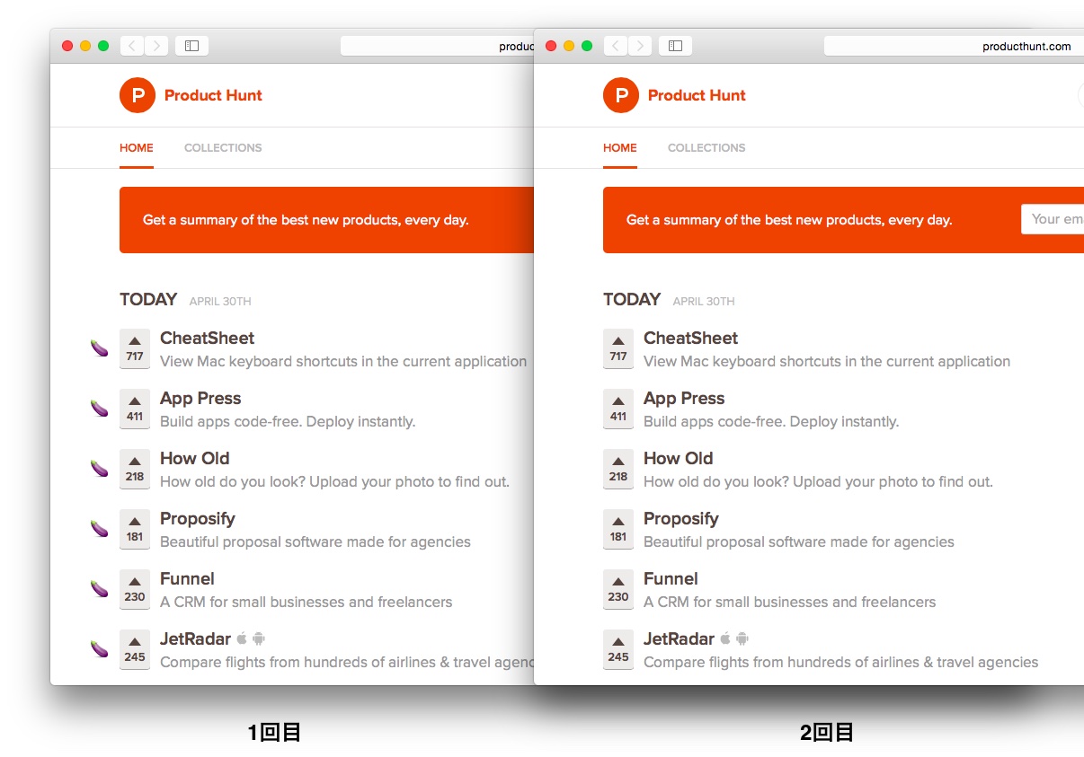 SeeHuntは最後に訪れたProduct Huntのプロダクトを記録して、次にProduct Hutを訪れた際、新しいプロダクトがあると茄子”🍆”絵文字を表示してくれるSafari機能拡張です。