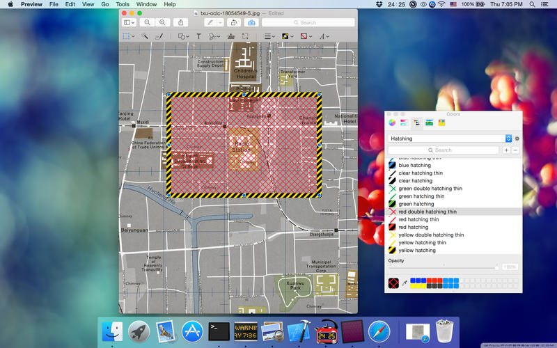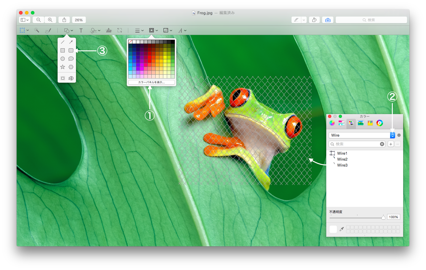 これで、OS Xのカラーパレットで使えるパターンファイル”clr”が作成されたので、プレビュー.appでシェイプツールなどを選択し、塗りつぶしパターンで先ほど作成したパターンを選択するとパターンが反映されます。