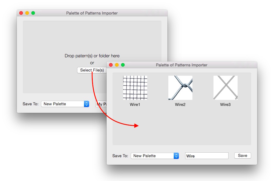使い方は簡単で、まずよく使うパターン画像を用意し、Palette of Patterns Importerにドラッグ&ドロップます(例では透過処理されたWireパターンを使いました)。