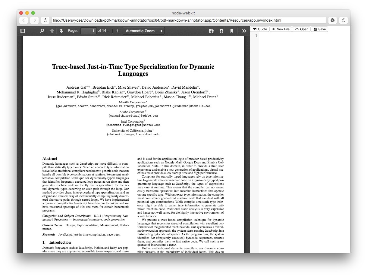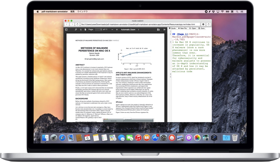 pdf-markdown-annotatorはazuさんが公開したPDFファイルを見ながらMarkdownでメモを取れるアプリで、NW.js(旧node-webkit)製でWindows/OS X/Linuxで使用できます。