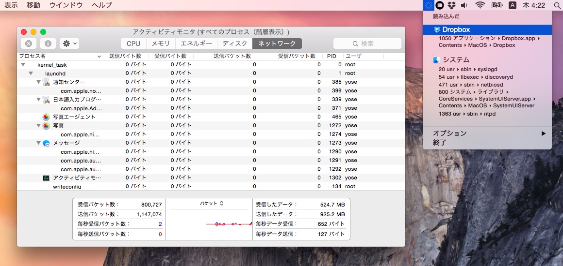 また、Optionキーを押しながらメニューバーアイコンをクリックするとアクティビティモニタ.appの[ネットワーク]タブで階層表示にした時の様に、ネットワークを使用しているプロセスとそのプロセスまでのパスが表示されます。