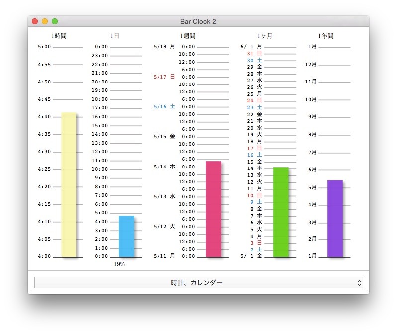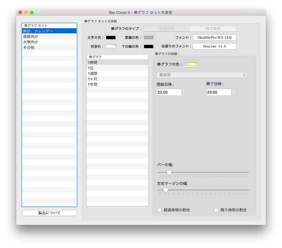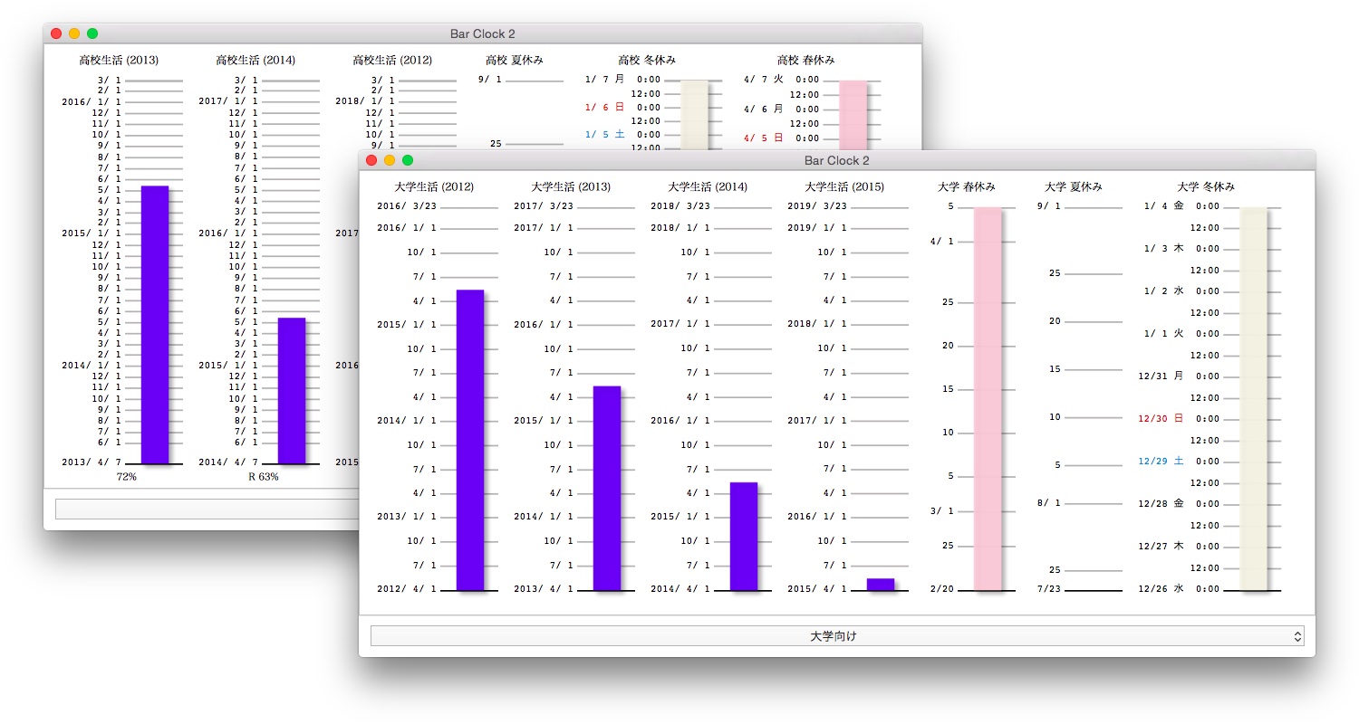 1年、月、週、日や高校/大学生活、夏休みなどの残り時間を棒グラフにして表してくれるMac用時計アプリ「Bar Clock 2」がリリースされています。詳細は以下から。