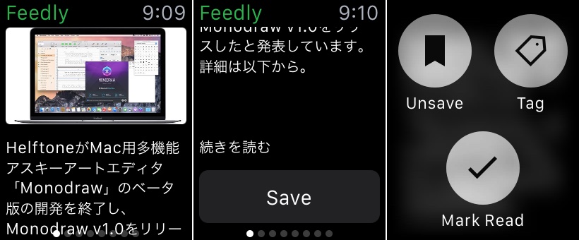 Feedly for Apple Watchはグランスには対応していませんが、ユーザーが登録しているRSS Feedから記事をピックアップしApple Watchに表示、スクロールして気になった記事を保存[Save]出来る他、Force Touchで既読[Read] や タグ[Tag]付けも可能です。