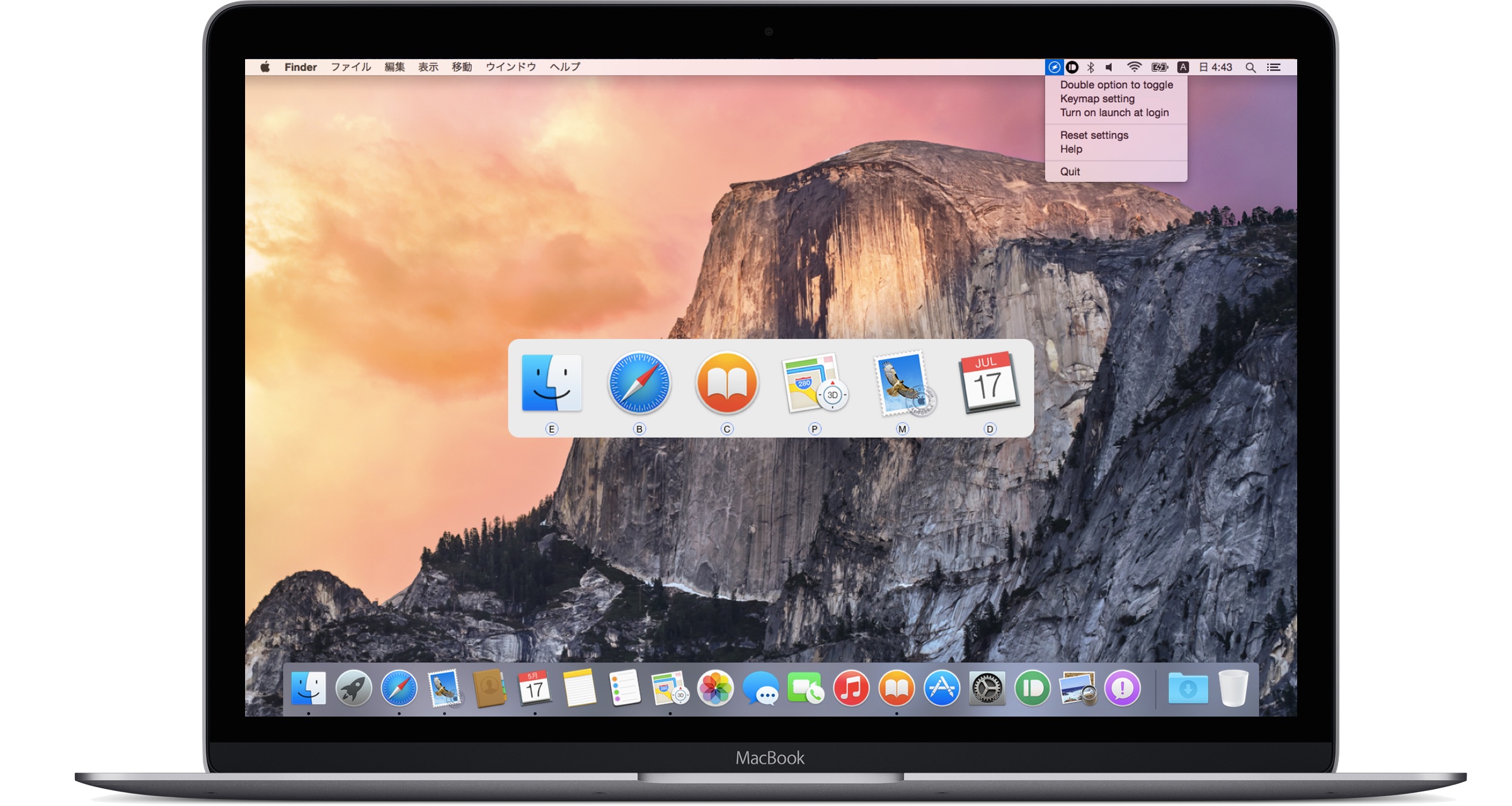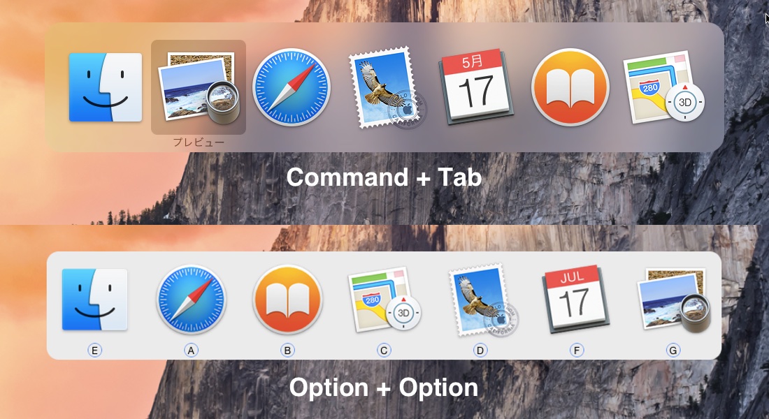 切り替えウィンドウは名前の通りOptionキーを2回(1回にすることも可能)押すだけで、Command + Tabより少ない動作でアプリを切り替えることが可能です。