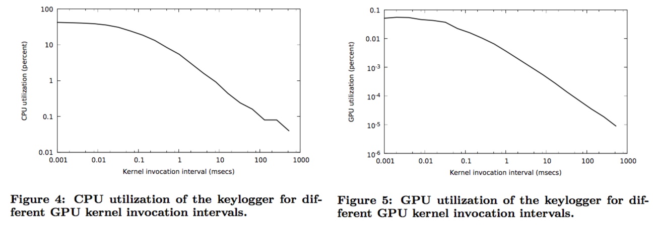 Figures 4 and 5 show the keylogger’s CPU and GPU utilization when varying the GPU kernel invocation interval. Typically, the duration of a single keypress varies from 100 ms for faster typists, to over one second for slower typists [14]. Consequently, the GPU invocation interval should be kept under 100 ms, to enable accurate monitoring of all key presses, without missed events. As shown in both figures, we have chosen an interval of 90 ms, which has minimal performance impact: the CPU utilization is about 0.1% (Figure 4), while the GPU has negligible utilization of 5×10^−5 % (Figure 5). The time needed by the GPU to read the contents of the 8-byte keyboard buffer over the PCIe bus is about 0.005 ms.
