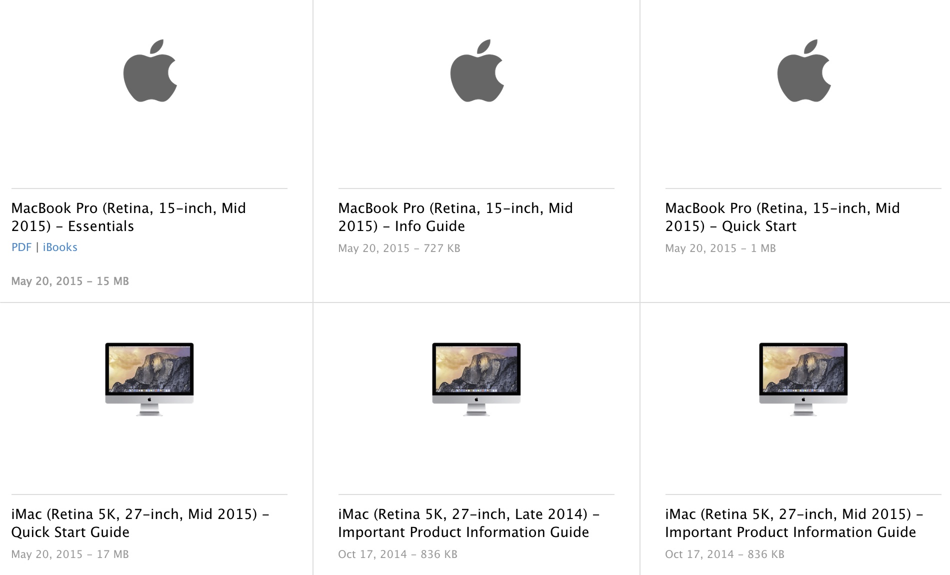 Appleが新たに公開したのはiMac (Retina 5K, 27-inch, Mid 2015)とMacBook Pro (Retina, 15-inch, Mid 2015)の基本、情報、クイックスタートガイドなど以下のマニュアル類で、