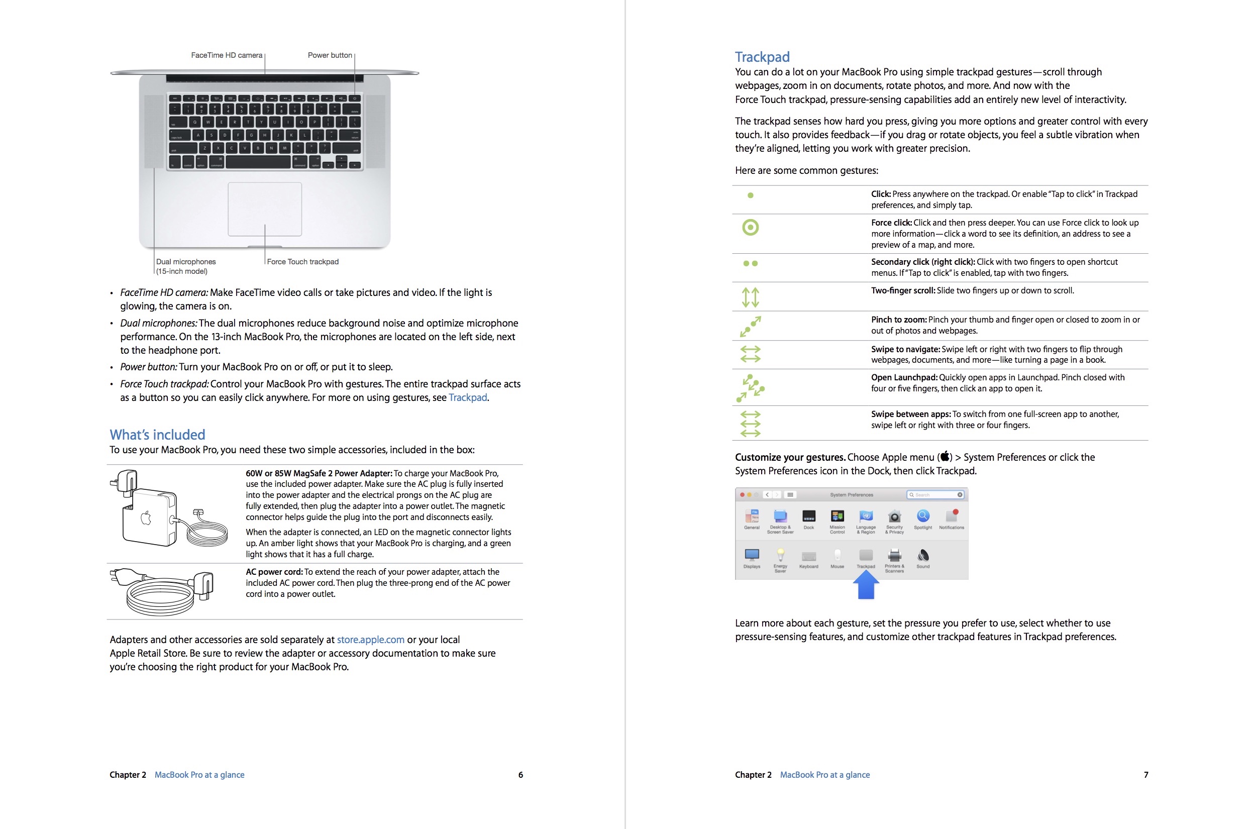 MacBook Pro (Retina, 15-inch, Mid 2015)のマニュアルには感圧タッチトラックパッドについての説明などが加えられています。ダウンロードはAppleのサポートページから(日本語マニュアルはまだのようです)可能なので興味のある方は関連リンクからどうぞ。