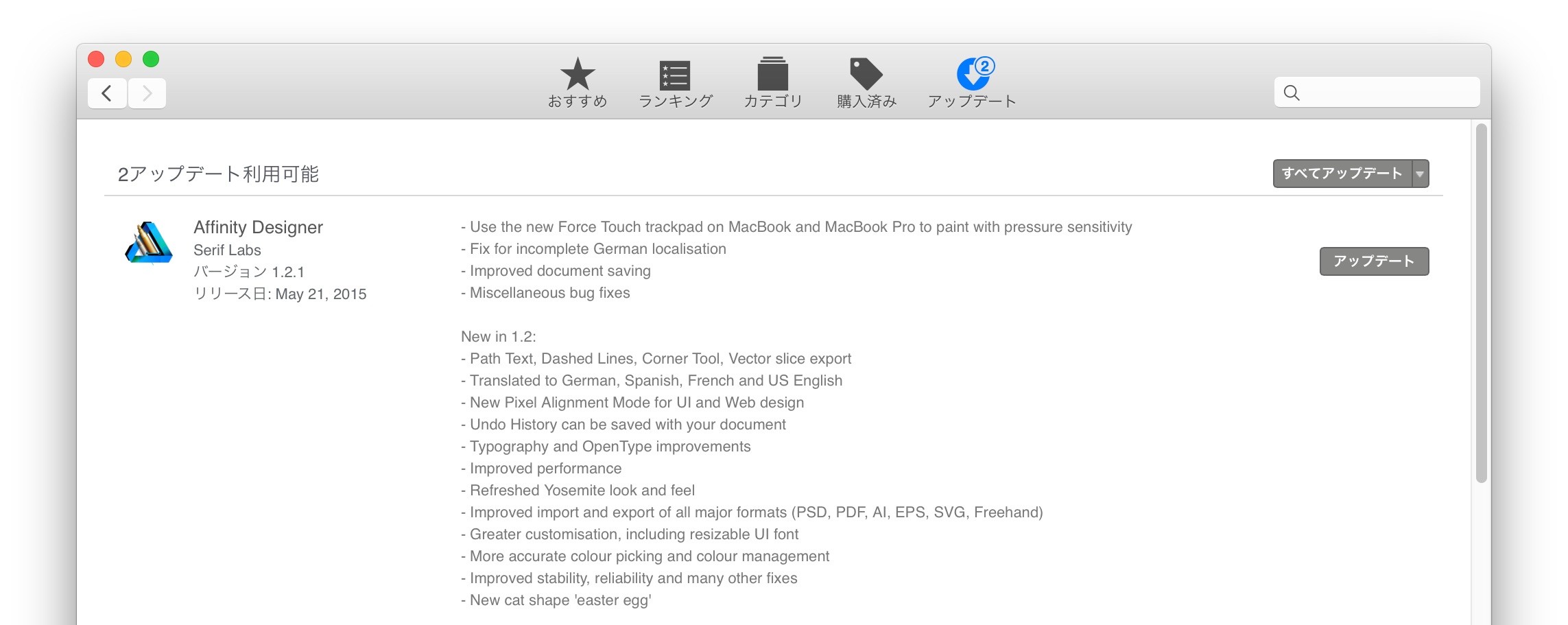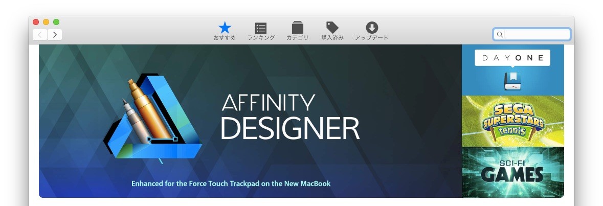 Serif Labsは25年間Windows用の写真編集アプリを作成してきたイギリスの会社で、去年からMac App Store Best of 2014にも選ばれたMac用のドローイングアプリ「Affinity Designer」の販売も行っていますが、この「Affinity Designer」が21日 v1.2.1にアップデートし新しいMacBookシリーズの感圧タッチトラックパッドのをサポートしたそうです。
