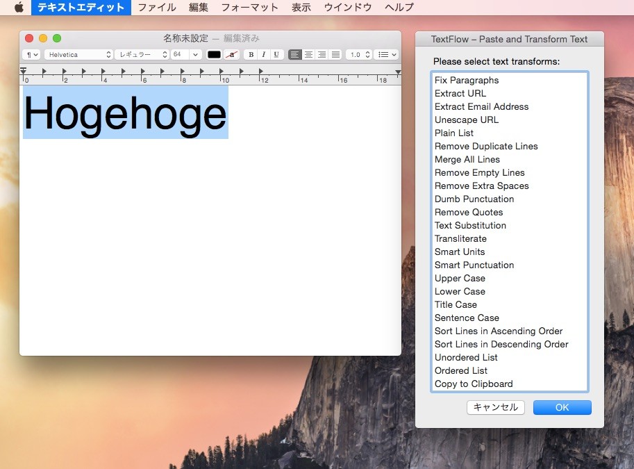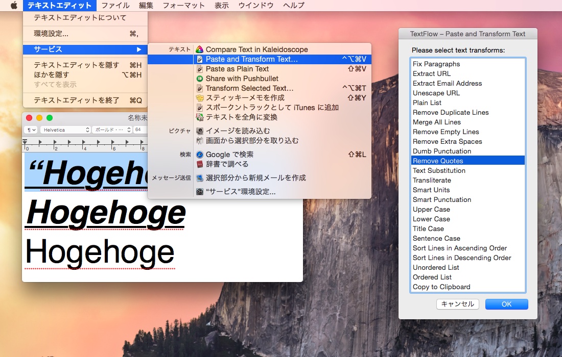 後はテキストを選択しサービスメニューかショートカットキーでTextFlowのサービスを選択すればテキストスタイルの削除や付加が出来ます。