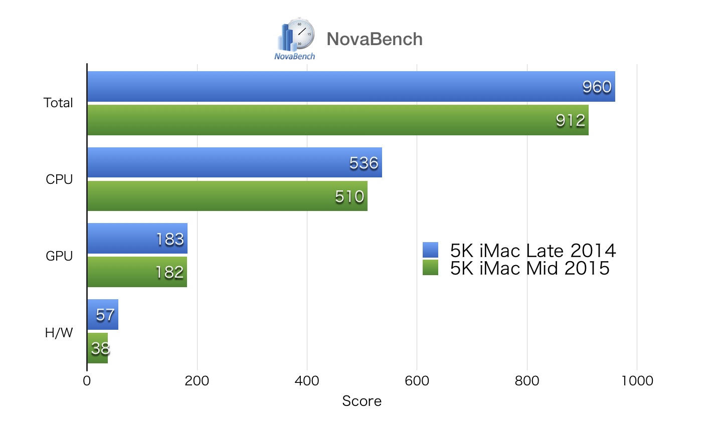 総合ベンチマークテストのNovaBenchでは、CPU, GPU, H/W(*RAMは同じなので省略)を比較しており、このスコアによるとAMD Radeon R9 M290は上位モデルのRadeon R9 M290Xと同程度のスコアを出しており、CPUとH/W(H/Wはストレージのスコアを含みます)が約20ポイントずつスコアを落としているようです。