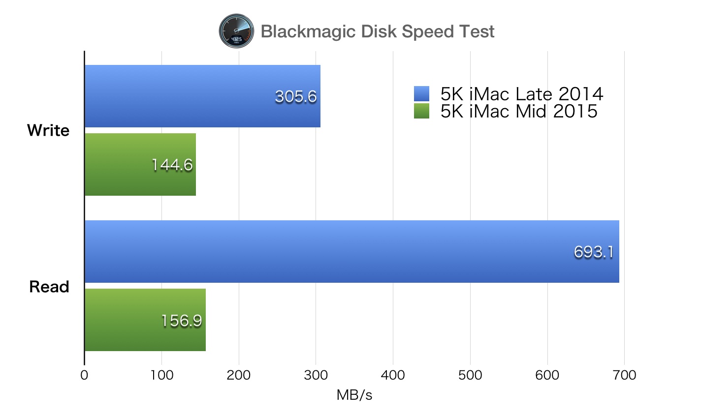 ストレージのRead/Writeをメディア再生の観点から測定してくれるBlackmagic DesignのDisk Speed Testの結果は以下の通りで、iCrackUriDeviceのMarshさんも「新しい(下位モデルの)iMac 5Kはストレージに7200RPMの1TB HDDを使用しているものの、(上位モデルの)フラッシュストレージとの差は大きくスローダウンしている」とコメントしています。