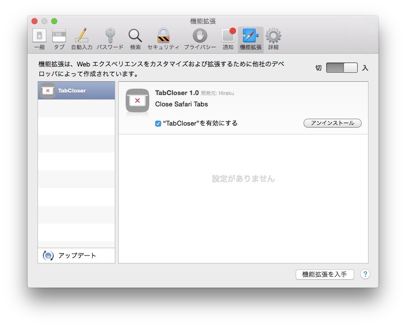 TabCloserは台湾のヒラクチャンさんが開発したSafari用 機能拡張で、大量に開いた同じドメインのタブや、指定したタブより右側/左側のタブをすべて閉じる機能が使用できます。