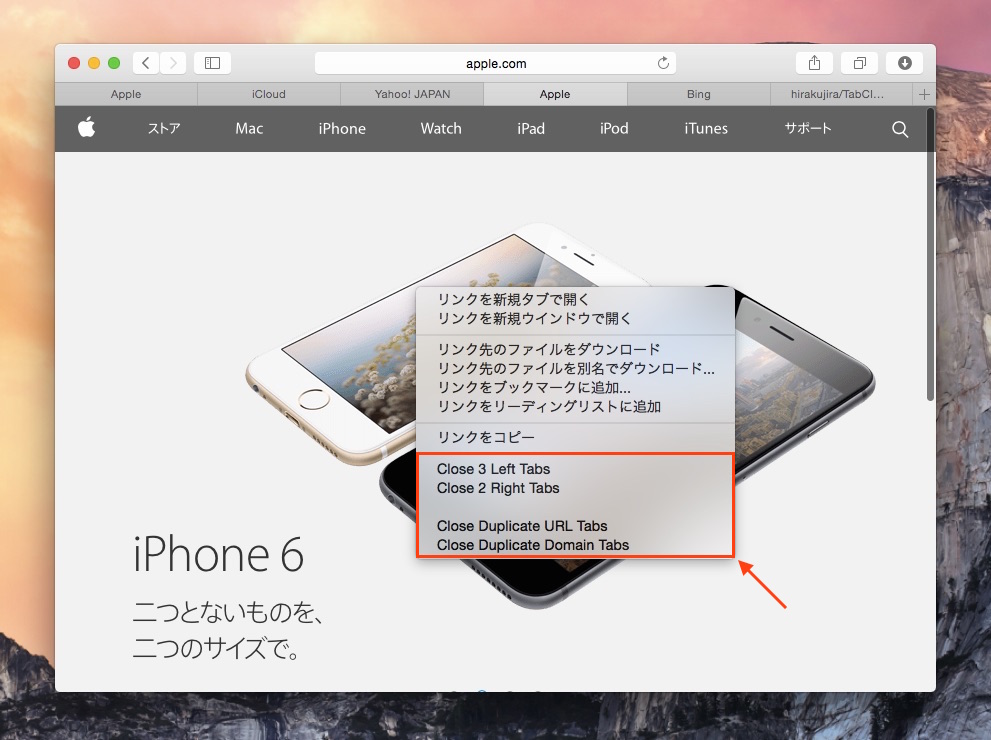 使い方はGitHubからファイルをダウンロードして中にある”TabCloser.safariextz”をダブルクリックでインストールするだけで、Safariがアクティブ中にコンテキストメニューを表示すると