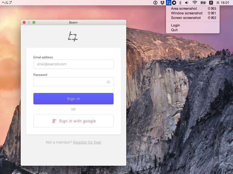 使い方はアプリをインストールしてBeemアカウントかGoogleのアカウントでログイン。後はメニュバーのアイコンかショートカットキーでスクリーンショットを撮影しると自動的にBeemにアップロードされURLを発行してくれます。