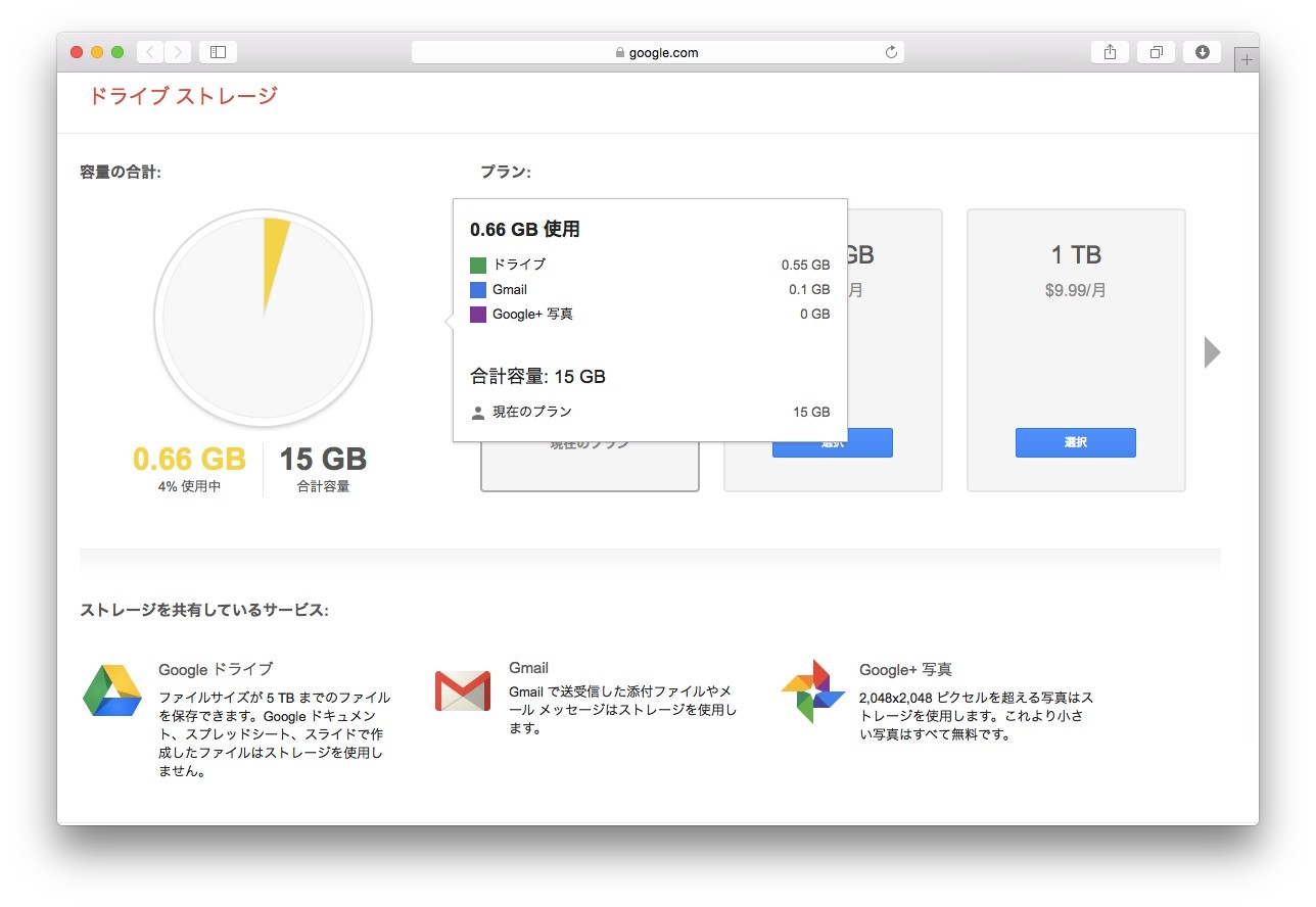 また、「元のサイズ」で設定した場合、Googleのストレージ容量をGoogleドライブ/Gmail/Google+写真で共有するようなので、容量が必要な方は1.99ドル/月で100GB, 9.99ドル/月で1TBなどを別途購入して下さい。