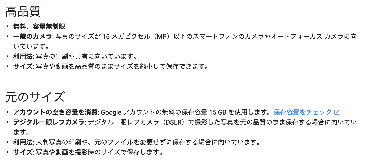 「高品質」はiPhoneや一般のカメラで撮影した16メガピクセルまでの写真、1080pまでの動画向けのサービスで、「元のサイズ」は一眼レフなどで撮影したRAW画像や大判写真印刷や画質を落とさずに写真を扱いたい場合に向いているとしています。