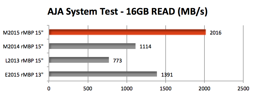 The new 15-inch MacBook Pro’s PCIe-based Flash Storage is a screamer. It is faster than any single flash module we have tested to date. (NOTE: The 256G version has a slower large sequential write speed of 1198MB/s.)