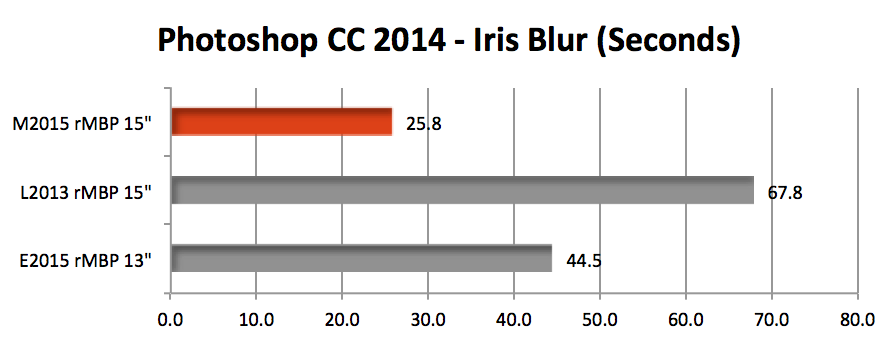 LuxMark 3 OpenCLでは約30%、Photoshop CC 2014を用いたIris Blurフィルタを掛けるベンチマークでは約2.5倍早く処理できているようです。(L2013 rMBP 15″との比較のみですがL2014と同じdGPUなのでL2014でも同程度だと思われます)