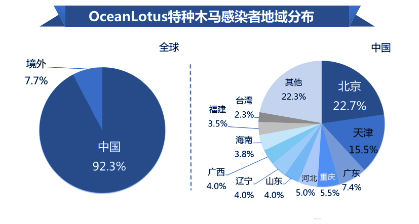 SkyEye Labs announced that it had captured more than 100 OceanLotus Trojan program samples of four different types, which had been planted in computers in 29 Chinese provincial regions and 36 countries.Over 92 percent of victim computers are in China, with Beijing being the hardest hit.