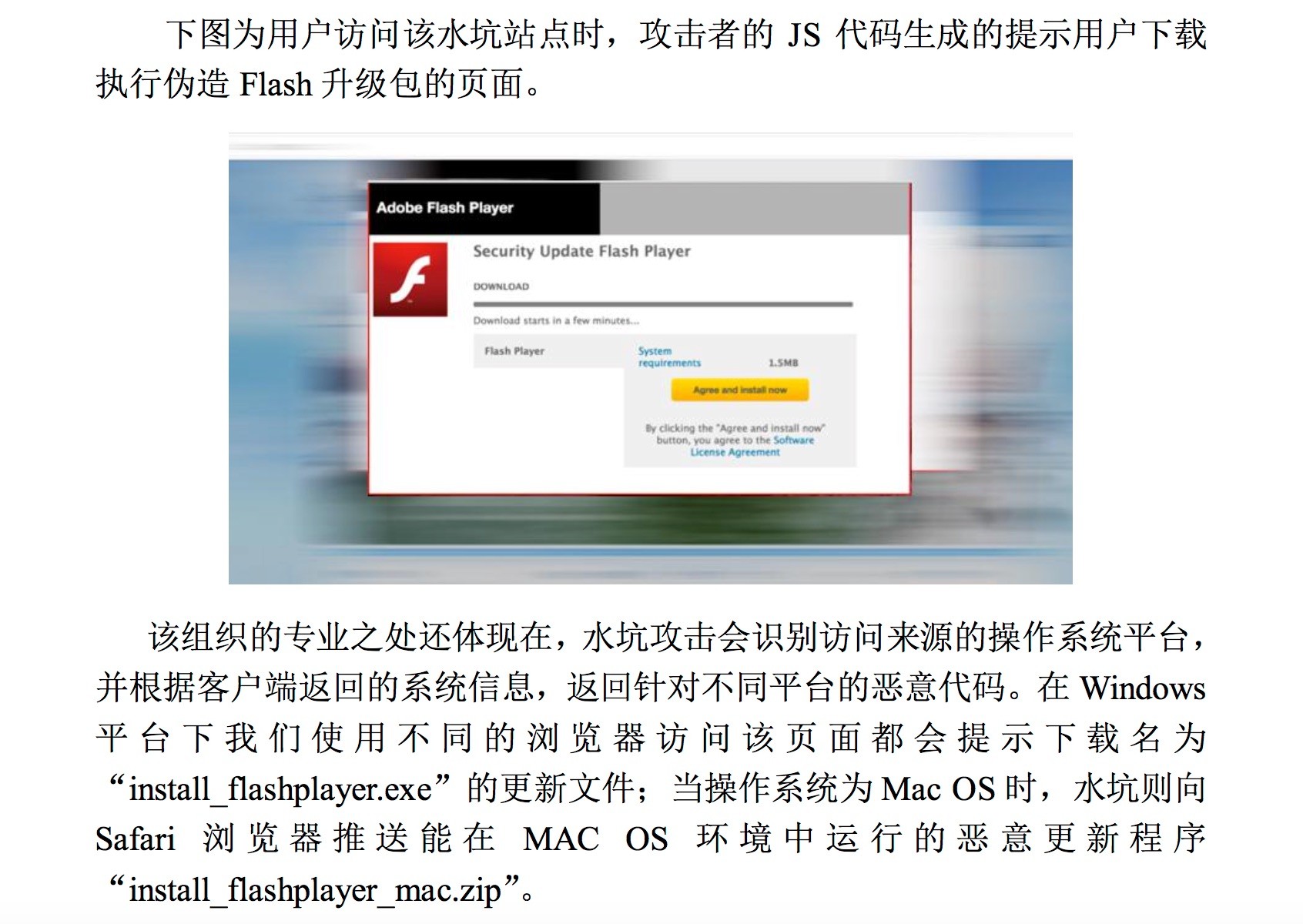 The Safe MacのThomas Reedさんは「レポートが中国語なので私が正しく理解しているかわからないが…」と前置きしながら、「OceanLotusのMac版は偽のAdobe Flash Playerのアップデート通知を介して広がり、ダウンロードしたFlashUpdate.app内に”.DS_Stores“という実行ファイルが隠れており、この実行ファイルによってファイルのダウンロードや通信のキャプチャ、任意のコマンドなどを実行する」とコメントしています。
