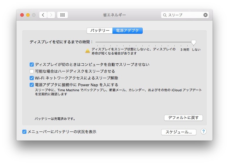 この脆弱性はroot権限を使用するため、Macを管理者として使用しているユーザー以外は脅威になりませんが(もちろん2014年製より後のMacBookユーザーも)、iMoreではシステム環境設定.appの[省エネルギー]からスリープをさせないように設定することを勧めています。