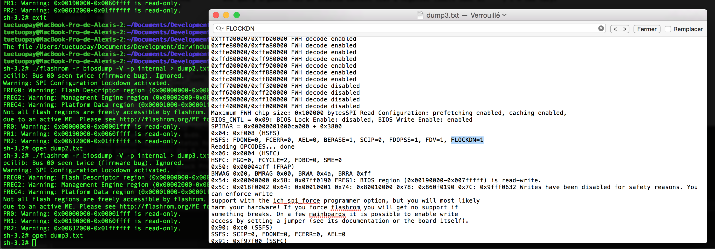 What we can see here is that the flash lockdown is active (FLOCKDN=1) and that the BIOS region is mostly read-only. The hole that is writable is the NVRAM portion that is necessary for setting boot options, crash logs and so on. The addresses where EFI binaries are located is lock down by the flash protections (PR0/PR1). The Dark Jedi attack would allow to unlock these areas and make them writable.