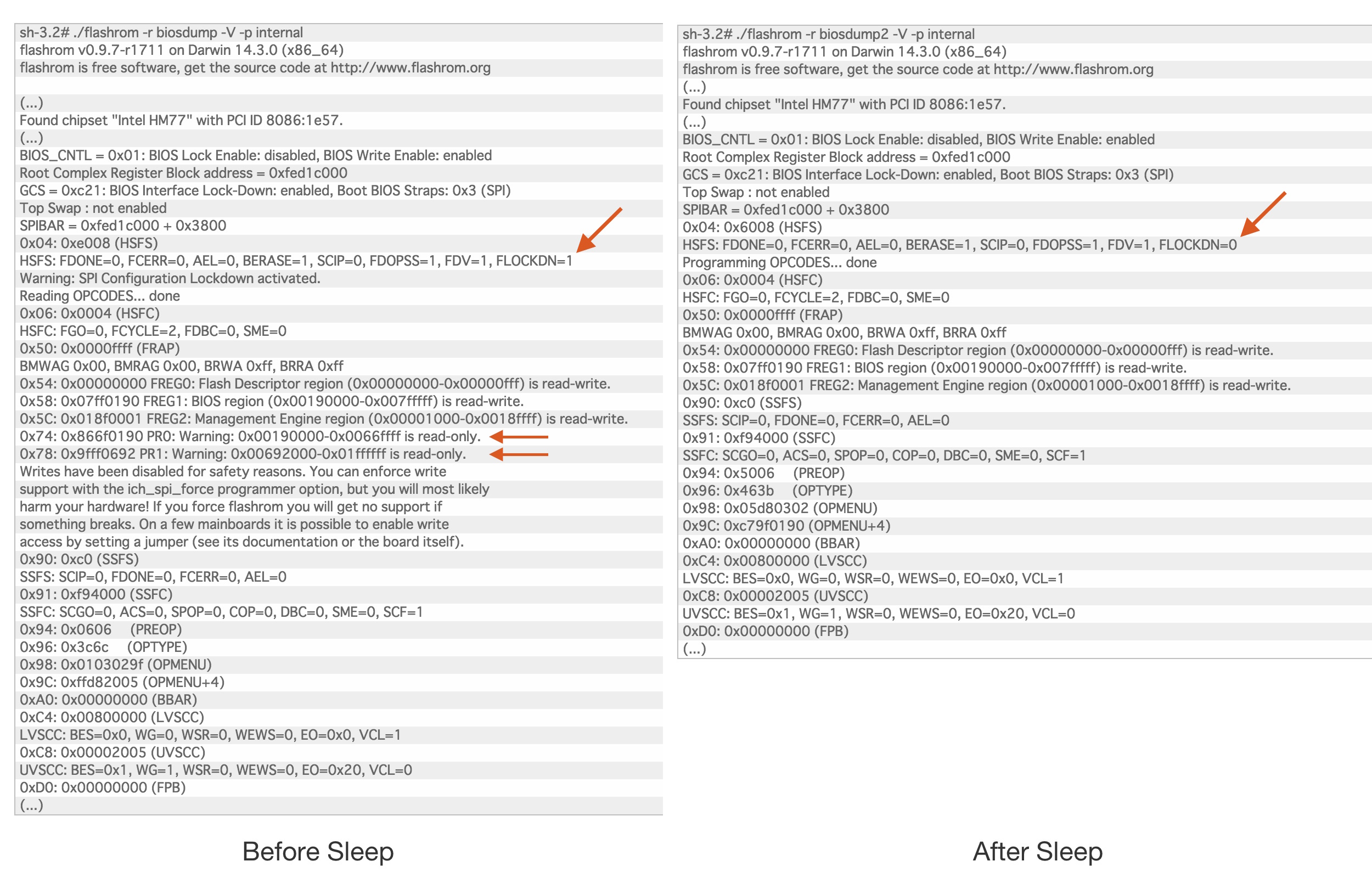 実際にMacBook Pro Retina 10,1を使用した実験では「スリープ前にはフラッシュロムのロック(FLOCKDN=1)がかかっており、BIOS領域(PR0/PR1)はread-onlyとなっているものの、MacBookを閉じて数秒スリープさせるというダーク・ジェダイの攻撃を行った後、ロックが解除(FLOCKDN=0)されPR0/PR1が無くなっている」ということが確認されており、