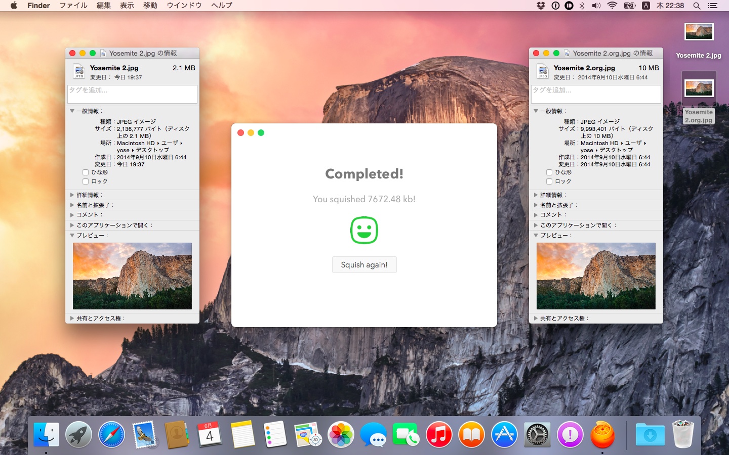 Squish for MacはJPEGminiやImageAlpha, ImageOptimの様に画像ファイルをドラッグ&ドロップするだけで画像を圧縮してくれるユーティリティアプリで、試しに5KサイズのYosemiteの壁紙(約10MB)を圧縮してみたところ2.1MB程に圧縮されました(ImageOptimの様に圧縮率のオプションなどはありません)。