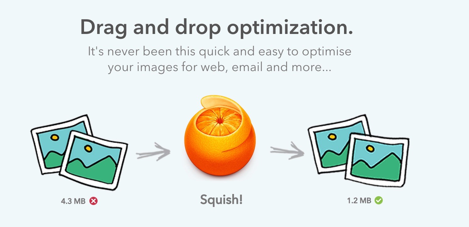 Squish is a super-simple app for compressing your images for lower filesize! Don’t lose quality, or end up with grainy or horrible images. Squish maintains their existing resolution and quality, and just reduces the filesize!