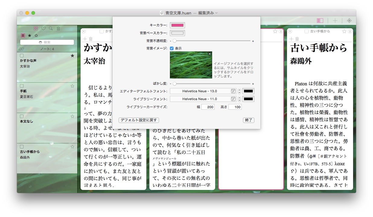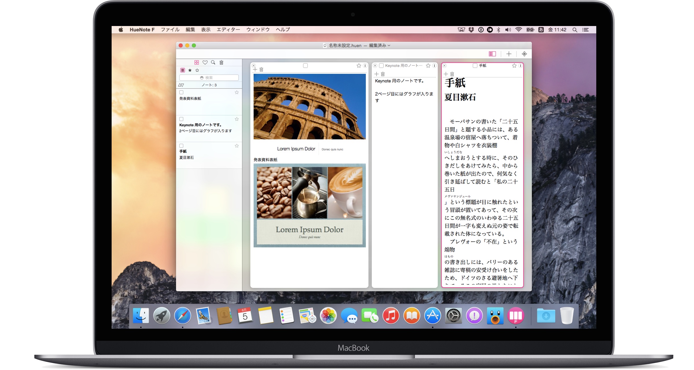 HueNoteはatelier miracle hueが開発しているMac用のリッチテキストエディタで、複数のノートを並べて編集&閲覧できます。