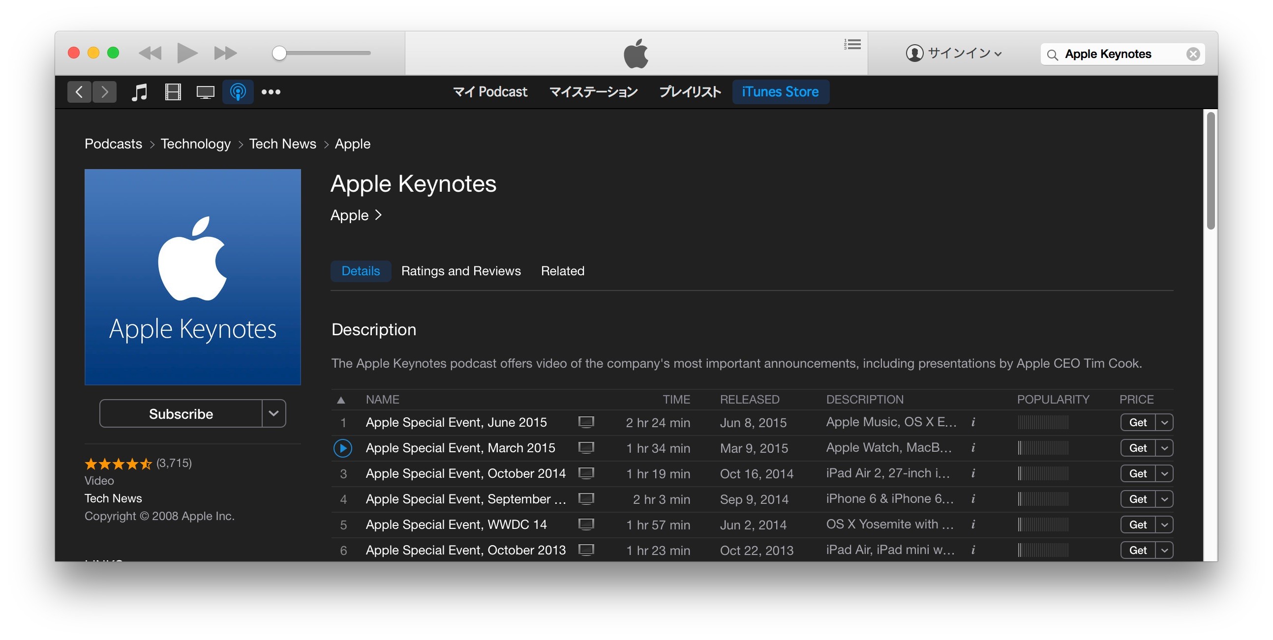 Appleが新たに公開している基調講演のPodcastは”Apple Special Event, June 2015″で解像度は以下の3種類。内容は既知の通りOS X El Capitan, iOS 9, watchOS 2, Apple Pay, Apple Musicなどで再生時間は2時間24分。