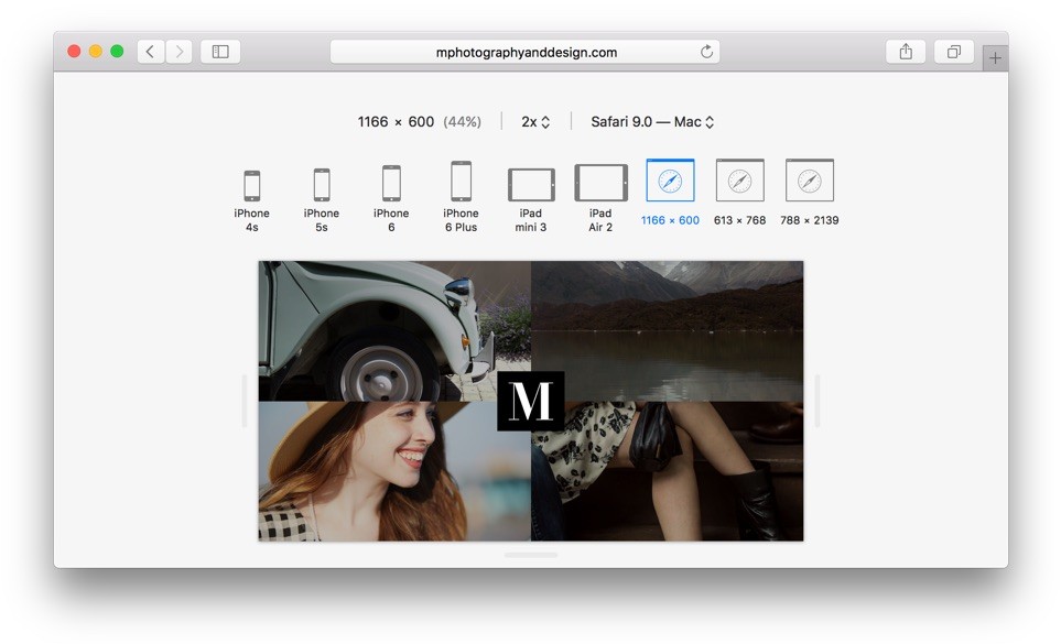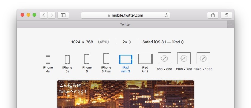 レスポンシブ・デザイン・モードではSafariのメインウィンドウ内にWebサイトのプレビュー(viewport)が表示され、プリセットされたAppleのデバイス(iPhone4s~, iPad mini 3, iPad Air 2, Mac)の解像度やユーザーエージェントの変更などが素早く行えます。