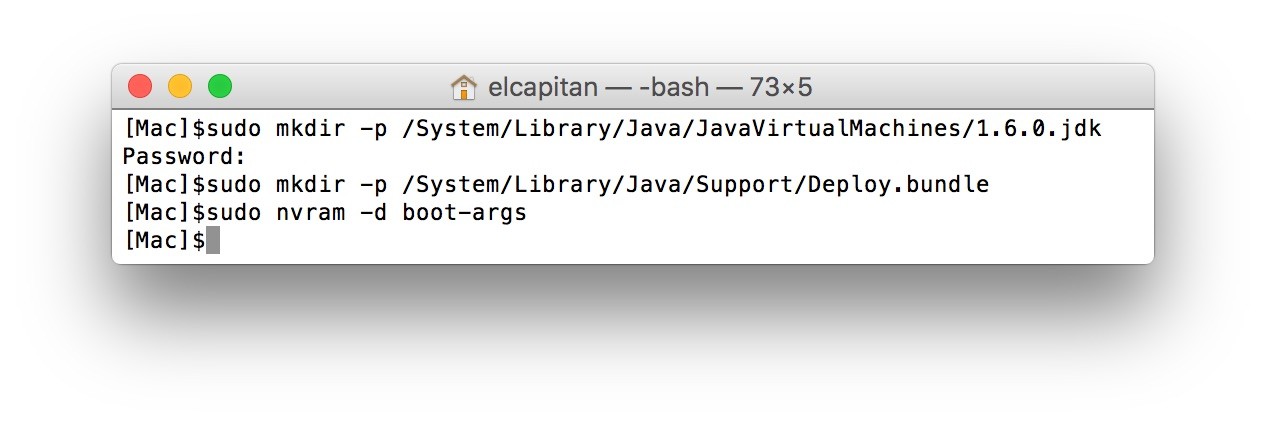 sudo mkdir -p /System/Library/Java/JavaVirtualMachines/1.6.0.jdk sudo mkdir -p /System/Library/Java/Support/Deploy.bundle sudo nvram -d boot-args