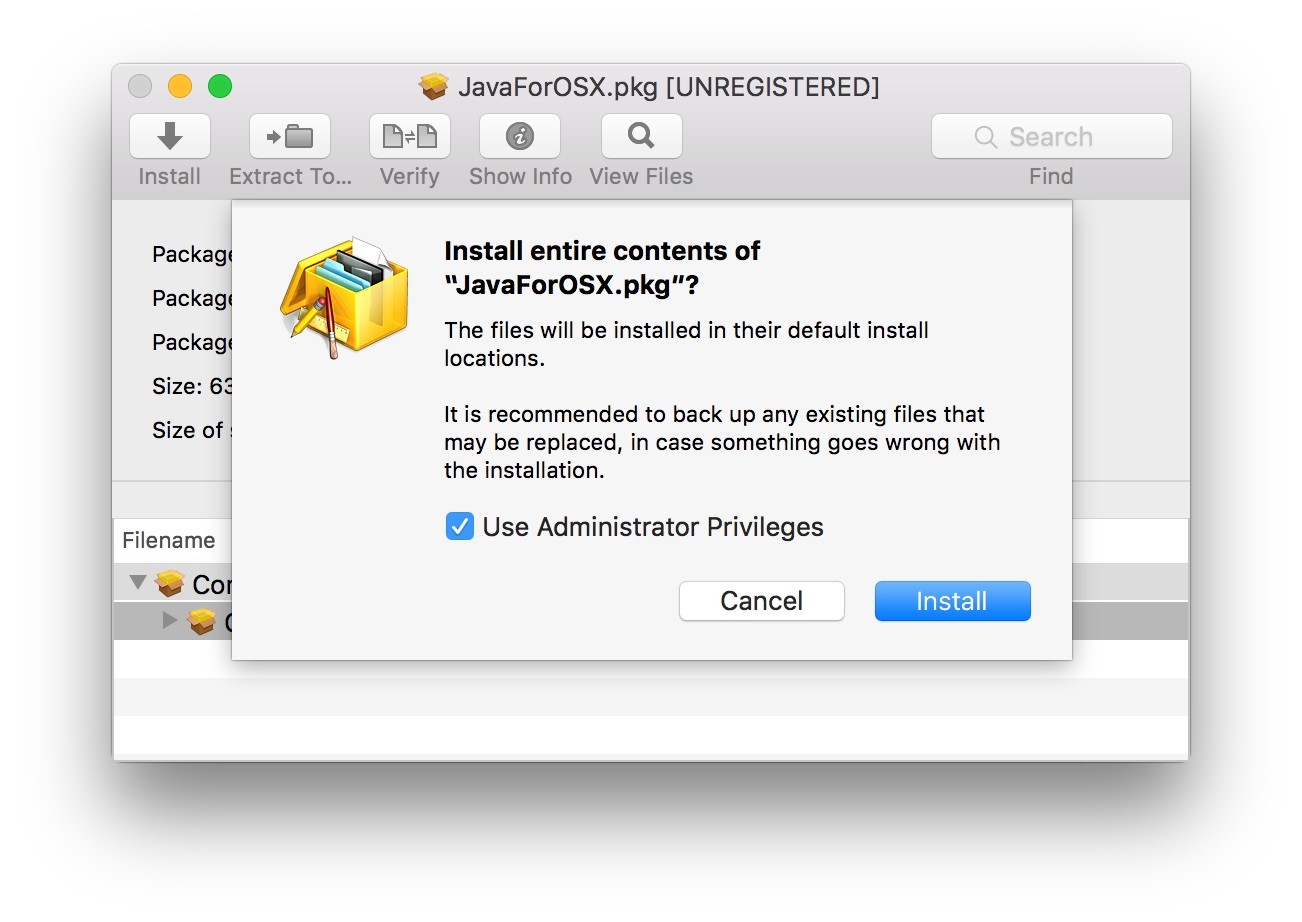”Java for OS X 2014-001″を強制的にインストールするには”UninstallPKG”と”Pacifist“を使用し、まずUninstallPKGでデフォルトでインストールされているJDKを削除し、Pacifistのpkg強制インストール機能を使用してJava for OS Xをインストールします。