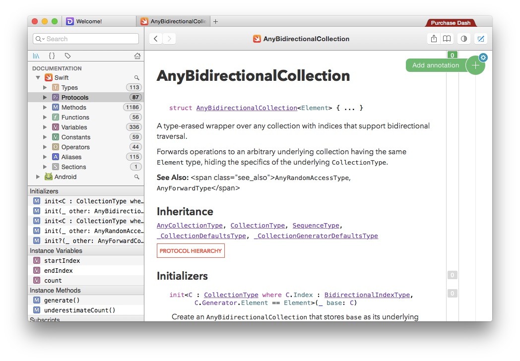 特に注釈機能”Annotations”はドキュメント内に右サイドの[Add Annotation]から注釈を挿入でき、GitHubに公開されている”Dash Annotations Server“を建てることで複数のDashユーザーで情報を共有することも可能です。