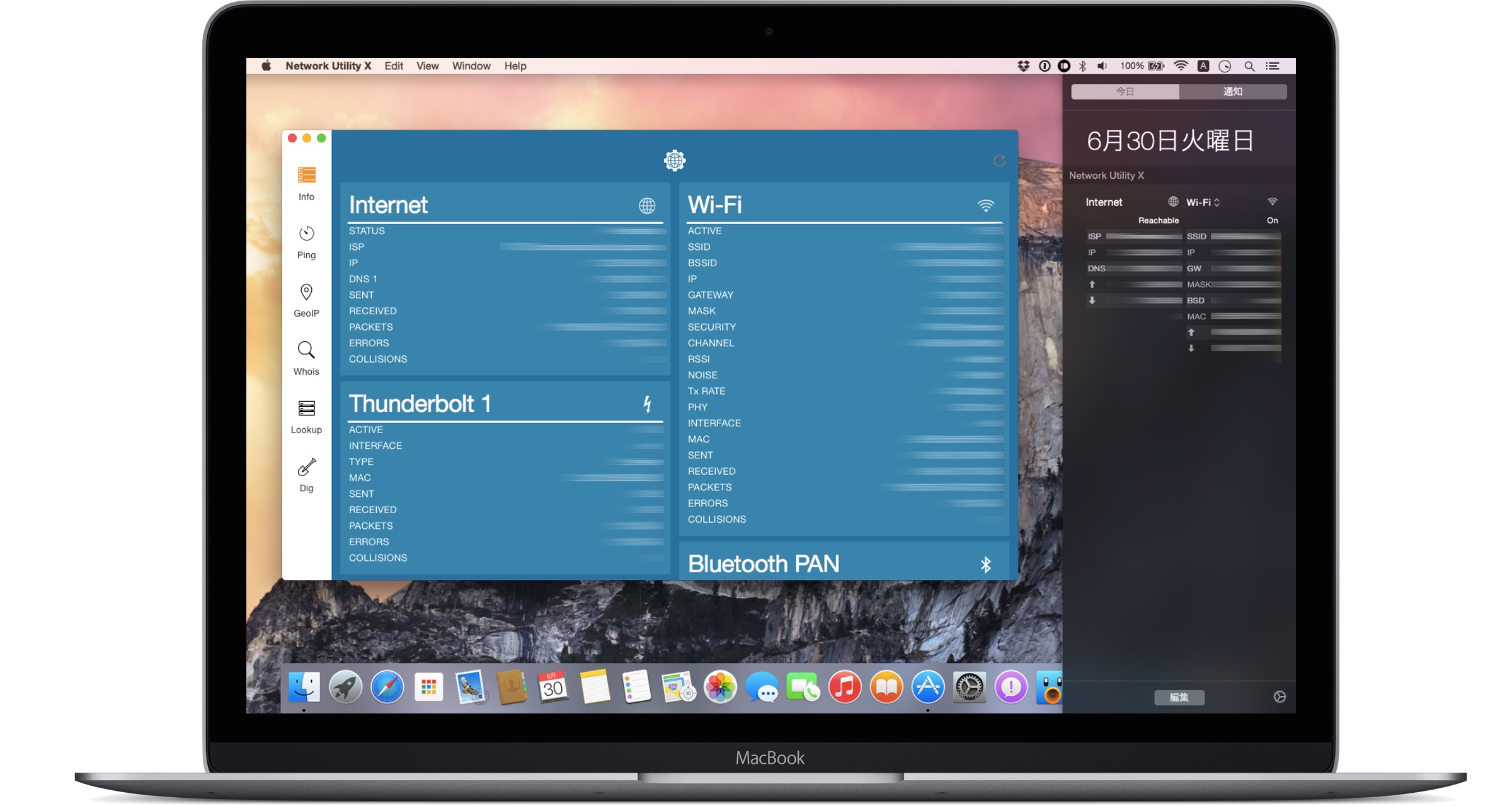 Network Utility X はMini PlayerやMonthlyCalをリリースしているDoubleREWが開発しているMac用ネットワークユーティリティアプリで、Macのネットワーク情報やPing、Global IPからの地図表示、Whois情報の取得などが可能です。