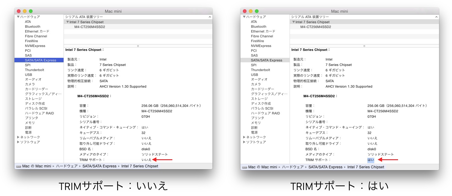 とりあえず手持ちのCrucial M4シリーズでは有効になることを確認しましたが、AppleのTrimドライバもLinuxのTrimドライバと同様にSSDとの相性(Trimが有効にできないのではなく、データ消失の恐れがあるという意味で)があると予想されており、