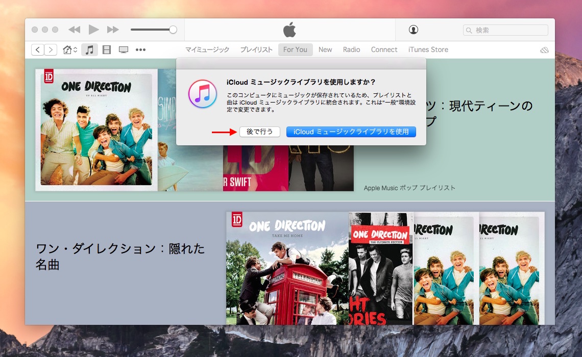 5.最後にiTunes 12.2を起動すると再び「iCloud ミュージックライブラリを使用しますか?」というダイアログが現れるので「後で行う」を選択すれば元のライブラリに戻っているはずです。