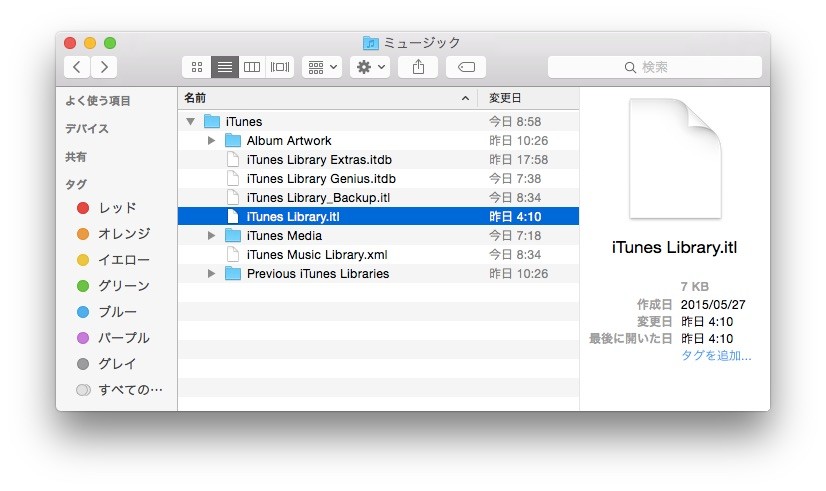 2.iTunesライブラリディレクトリに移動し、iTunesがバックアップしたITL(iTunes library)ファイルを”Previous iTunes Libraries”内からiTunesフォルダ内に移動(コピー)します。