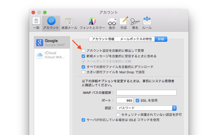 この不具合はOS X 10.10.4 Yosemiteでメールアプリがアップデートされた事が原因で発生していると思われますが、この不具合が発生した場合はメールアプリの[環境設定..] > [アカウント] > Googleアカウントを選択 > [詳細タブ] に表示されている「アカウント設定を自動的に検出して管理」をOFFにすることで解決するそうなので、Gmailが受信できない方は試してみてください。