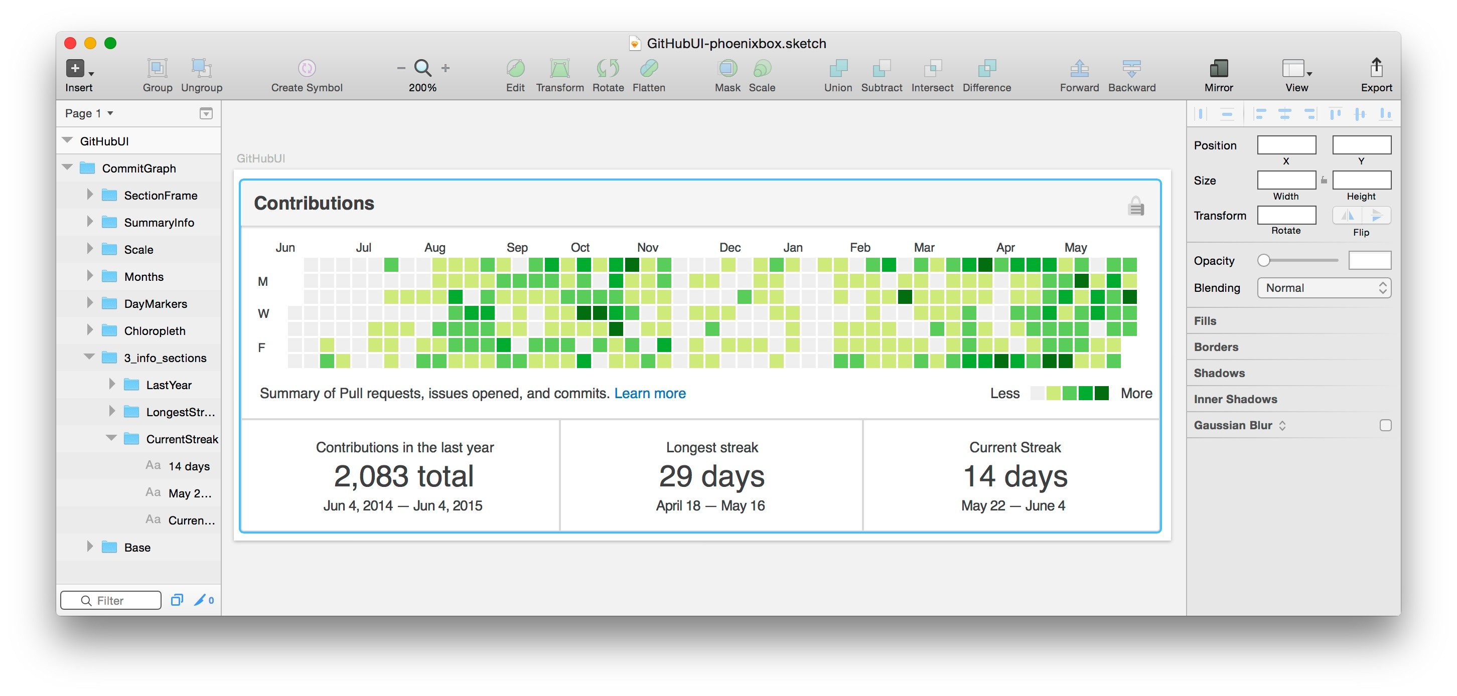 この素材”GitHubUI-phoenixbox.sketch”はデザイナーのShane Rogersさんが公開したもので、グラフのContributionsセル全て編集可能なので以下の様に自由にデザインが可能です。