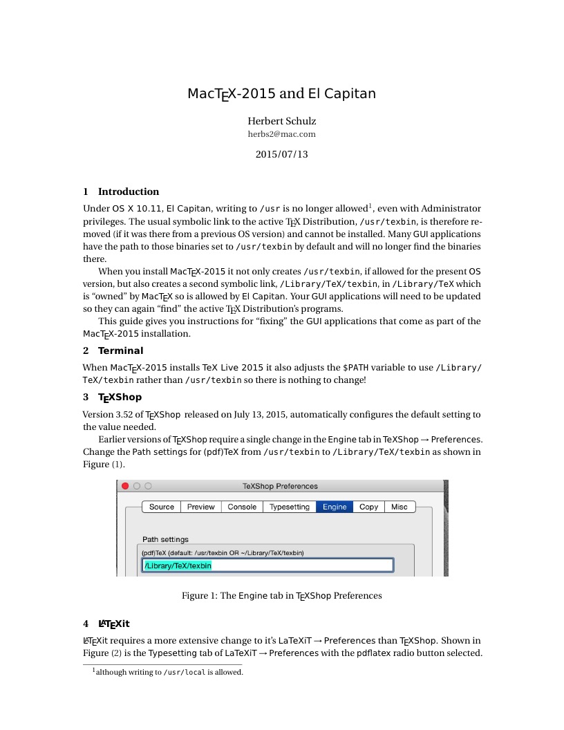 MacTeXを公開しているTUG(TeX Users Group)のHerbert Schulzさんが7月13日付けでサポートドキュメント”MacTeX-2015 and El Capitan(*PDF)”を公開しています。