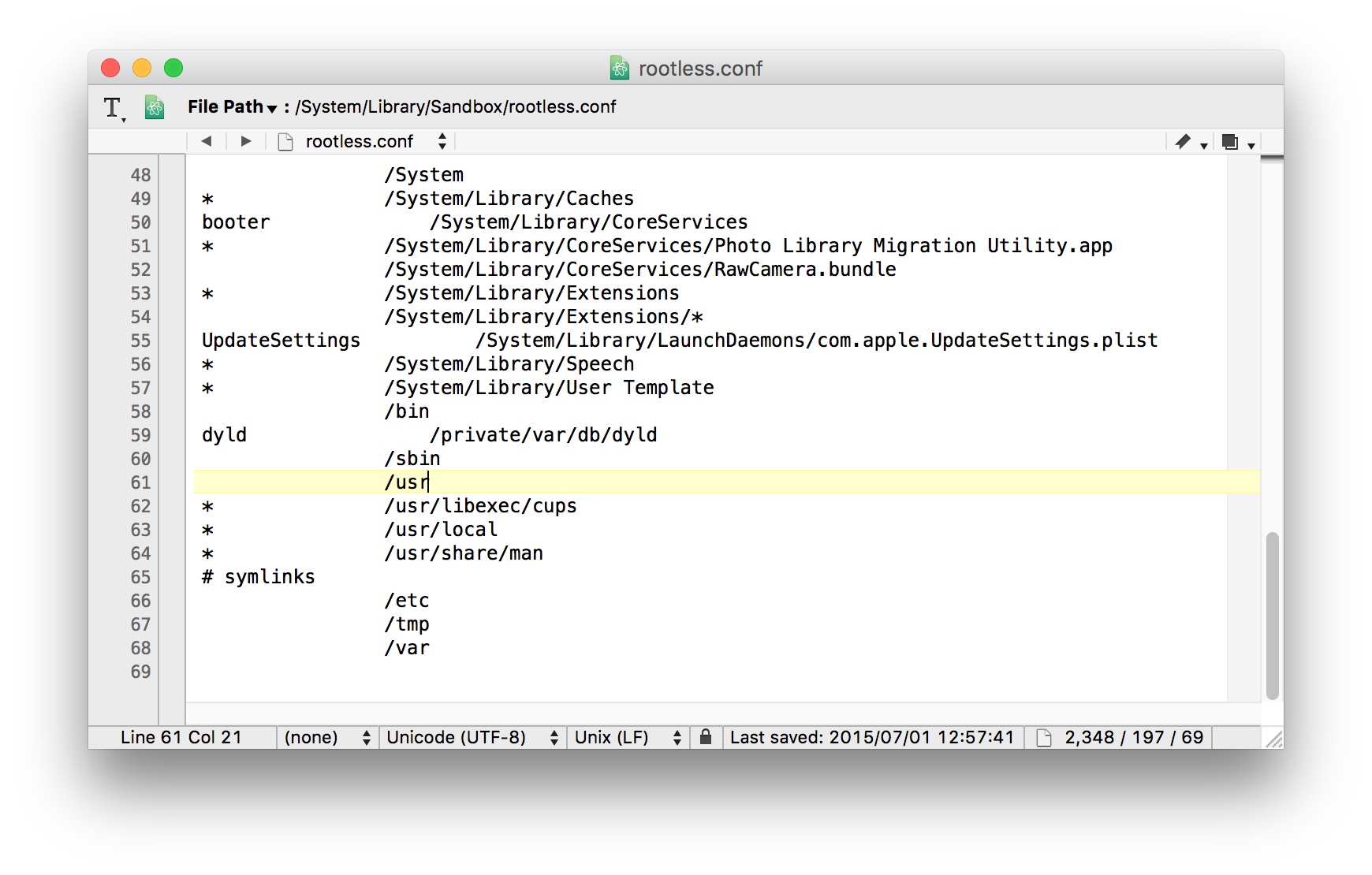 - OS X 10.11 El Capitanには新しいセキュリティ機能「rootless」が追加され、rootユーザーでも”/usr”フォルダなどにアクセス制限がかけられているもよう