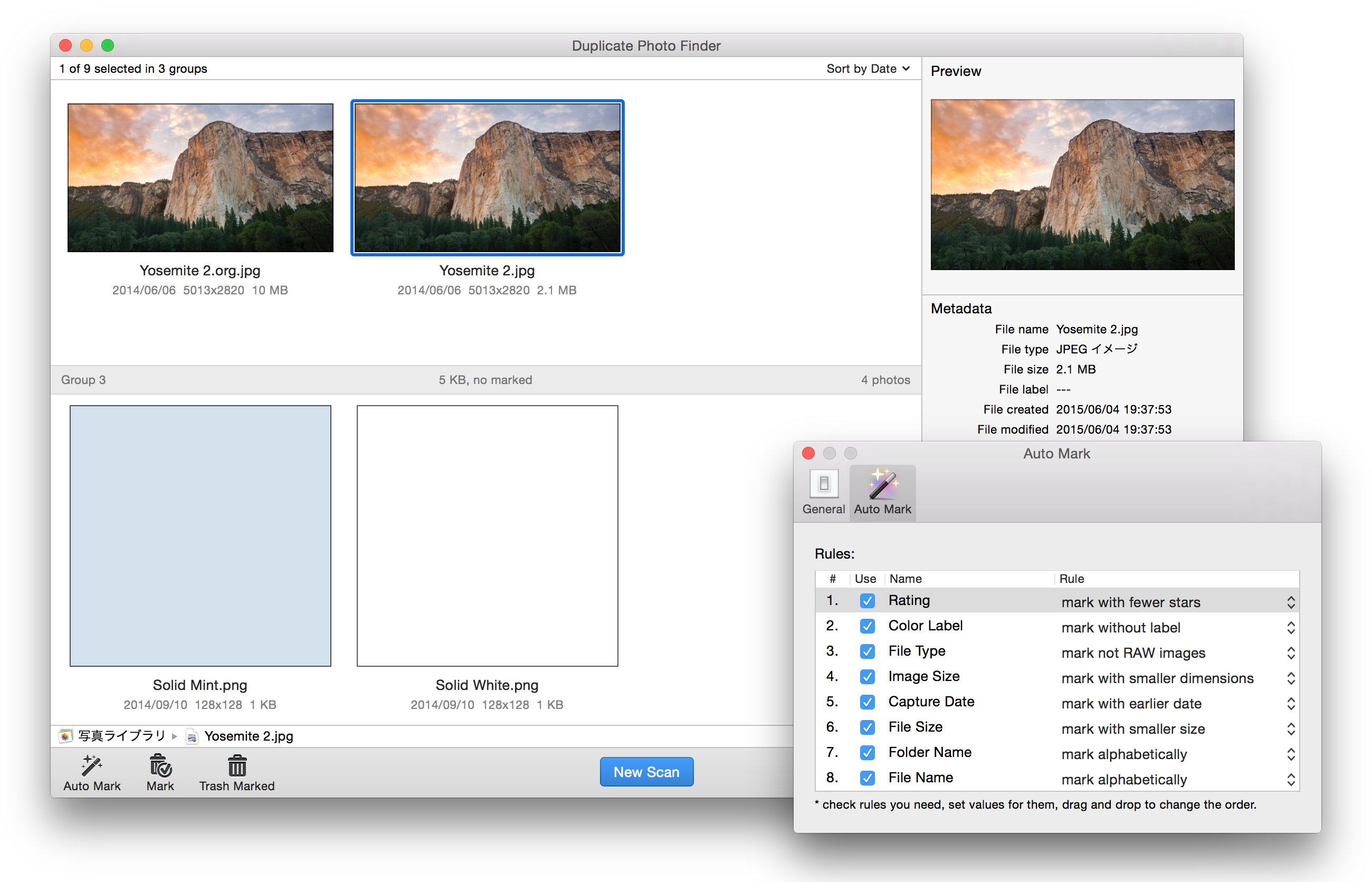 Duplicate Photo FinderはPhotoSweeperの機能限定版でPhotos.appにしか対応していませんが、「類似写真の作成日の新しいファイルを選択」や「類似写真のファイルサイズの小さい方を選択」などのオートマーク機能も使用可能です。
