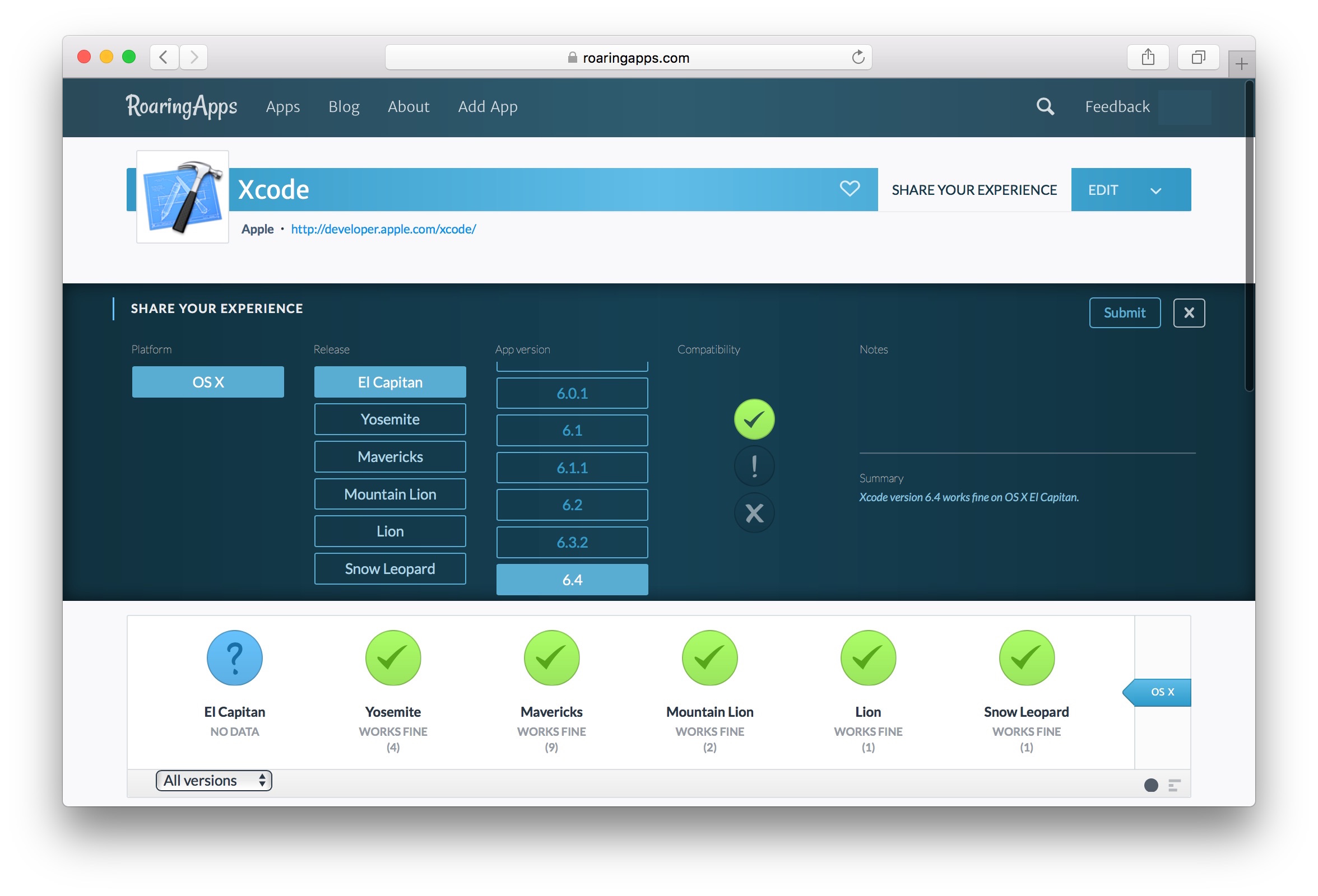 次期OS XやiOSでのアプリの動作情報を共有できるサイトRoaringAppsが先月より行っていたアップデートを終了し、OS X 10.11 El CapitanやiOS 9でのアプリの動作状況についても情報を共有できるようになったそうです。