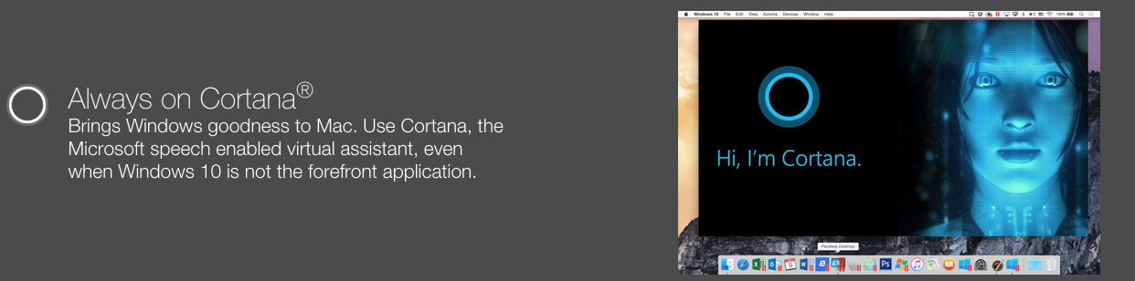 According to the site you can use Cortana even when Windows 10 is not the forefront application – meaning, you can enable ‘Hey Cortana’ to work at any time while using OS X (as long as Windows 10 is running). This is a change from how the tool currently works with Parallels, and clearly the company views this as a reason to upgrade as they see the value that Cortana brings to the desktop.