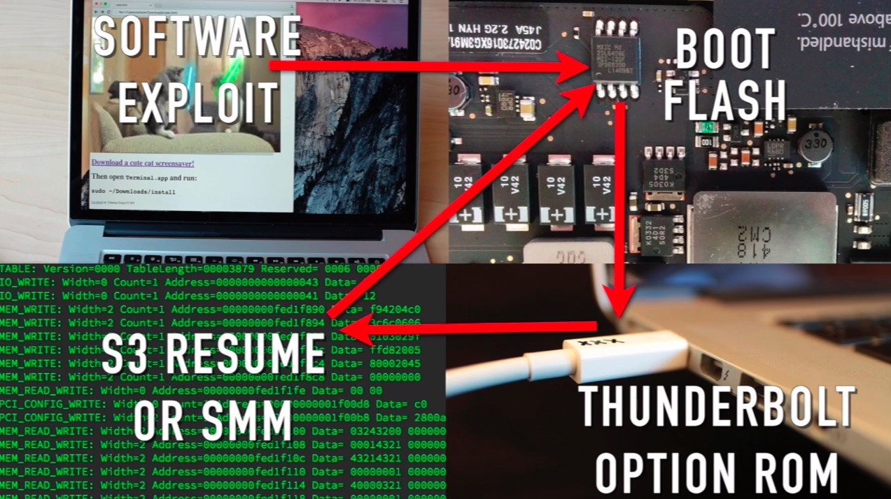 今年初めドイツのハッカー集団 カオス・コンピュータ・クラブで「Thunderboltに接続したOption ROMからMacのEFIファームウェア脆弱性を利用して書き換えられたEFIはOS Xを再インストールしても消えること無く、Macのハードウェアの制御などが可能になる」という攻撃手法”Thunderstrike”を公開し話題になりましたが、