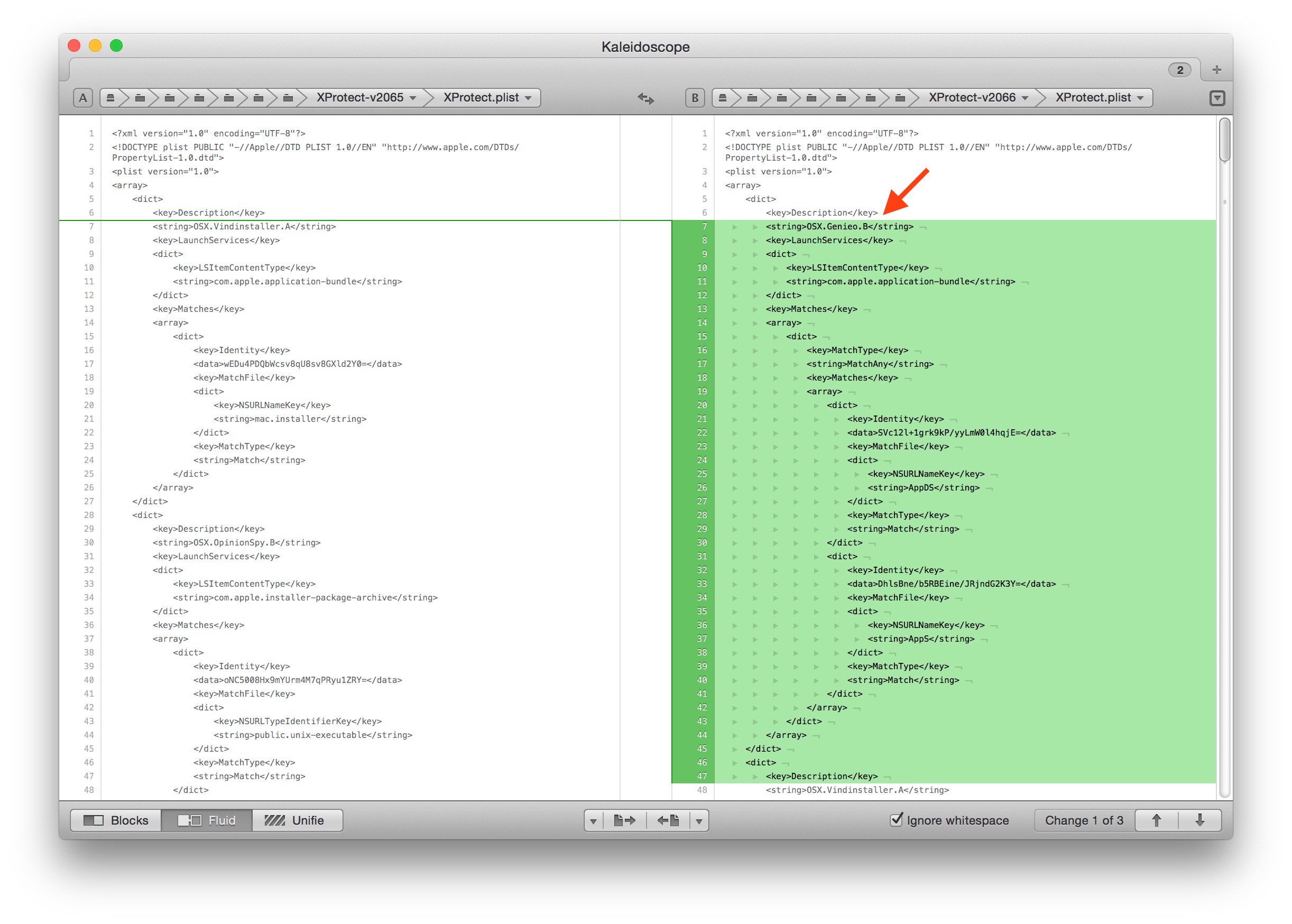 今回のXProtect v2066ではDYLD_PRINT_TO_FILEの脆弱性を利用しOS Xのsudoerファイルを書換え、root権限でアドウェアをインストールするアプリ”OSX.Genieo.B”を追加、さらに”OSX.InstallImitator”.Cと.Aに新たなデータベースを更新しています。