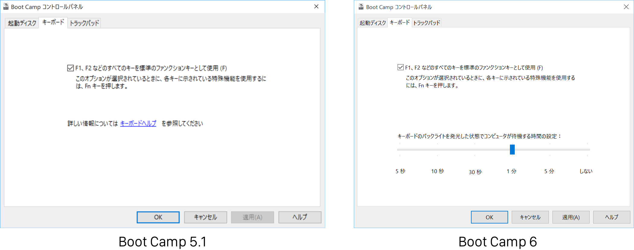 以前Windows 8.1からWindows 10へアップグレードしたMacBook Pro RetinaのBoot Campを早速アップデートしてみたところ、新たに複数のドライバーがアップデートされた他、Boot Campコントロールパネルに「キーボードのバックライトを発光した状態でコンピュータが待機する時間の設定」というオプションが追加されていました。