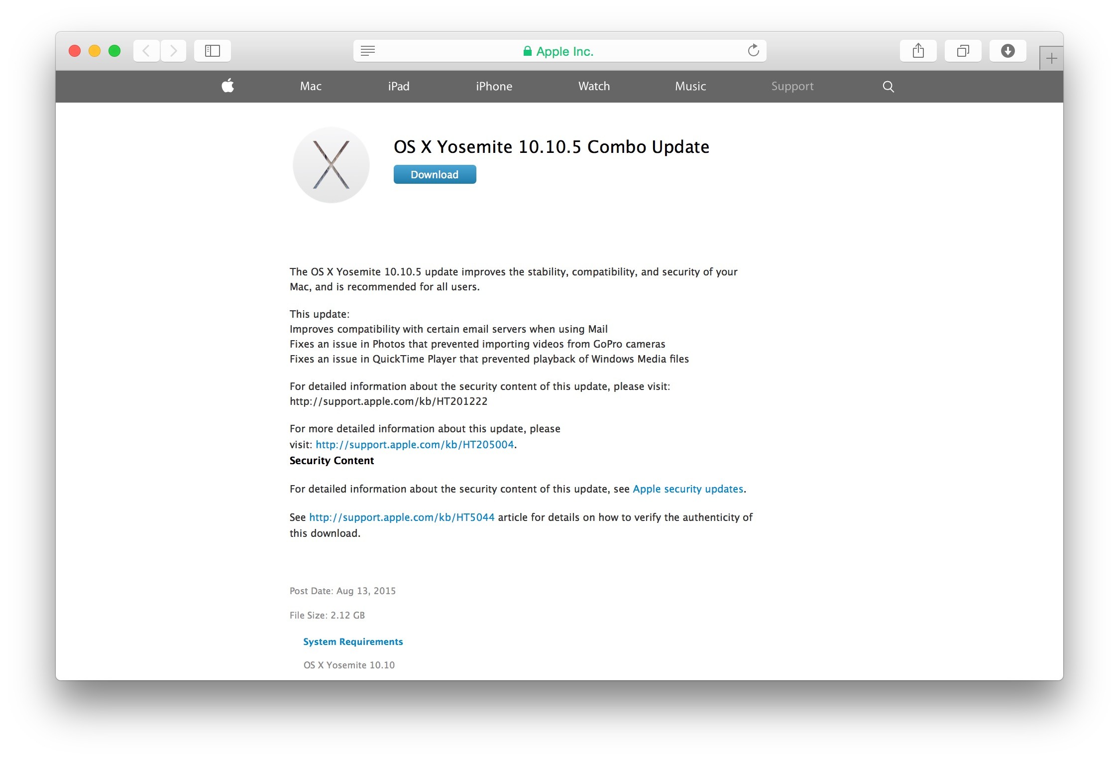 ファイルサイズは2GB超え(2.12 GB)で、”OS X Yosemite 10.10.5 Update”を含め以下のサイトからダウンロード可能です。